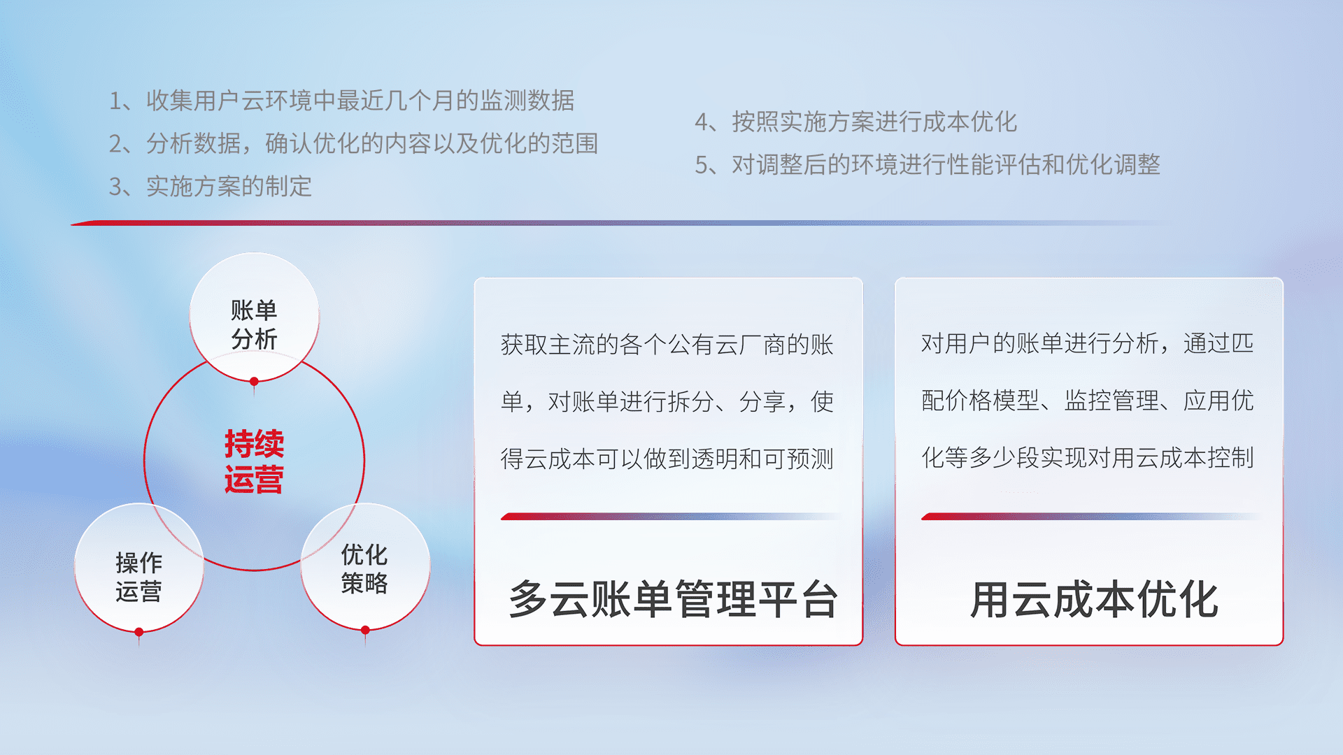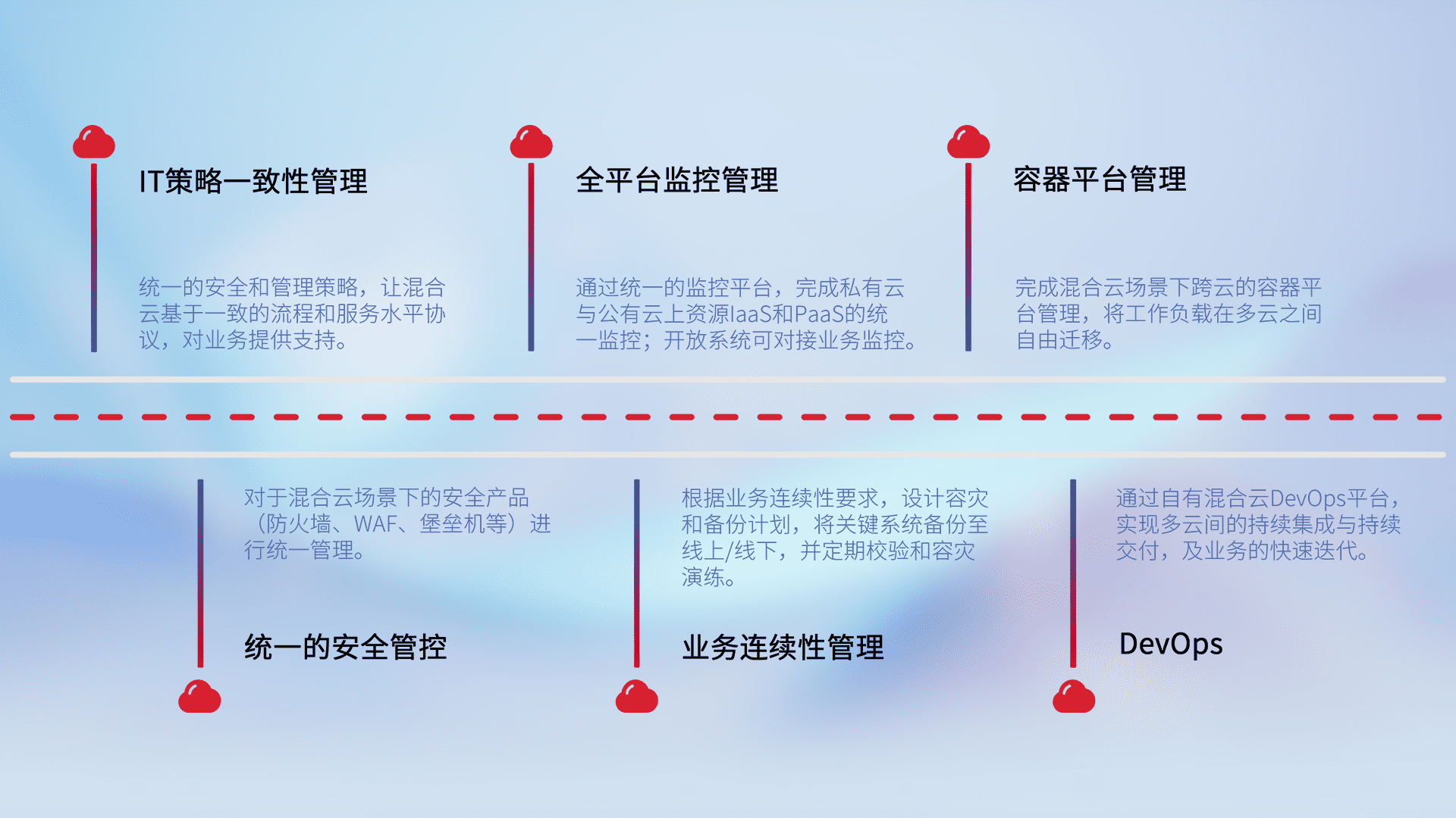 通过多云纳管,,以统一的资源数据模型把客户的云资源进行抽象和封装,,,,进而实现对多云资源的统一操作,,保障云资源管理的可靠性、、、稳定性与可用性。。。。量身定制化运维内容,,,,配置、、、、开发运维、、、、补丁管理、、、、备份、、监控、、认证和访问管理、、、审计和日常巡检等,,,保障在用云过程中的可靠度,,,稳定度以及高可用率。。。。