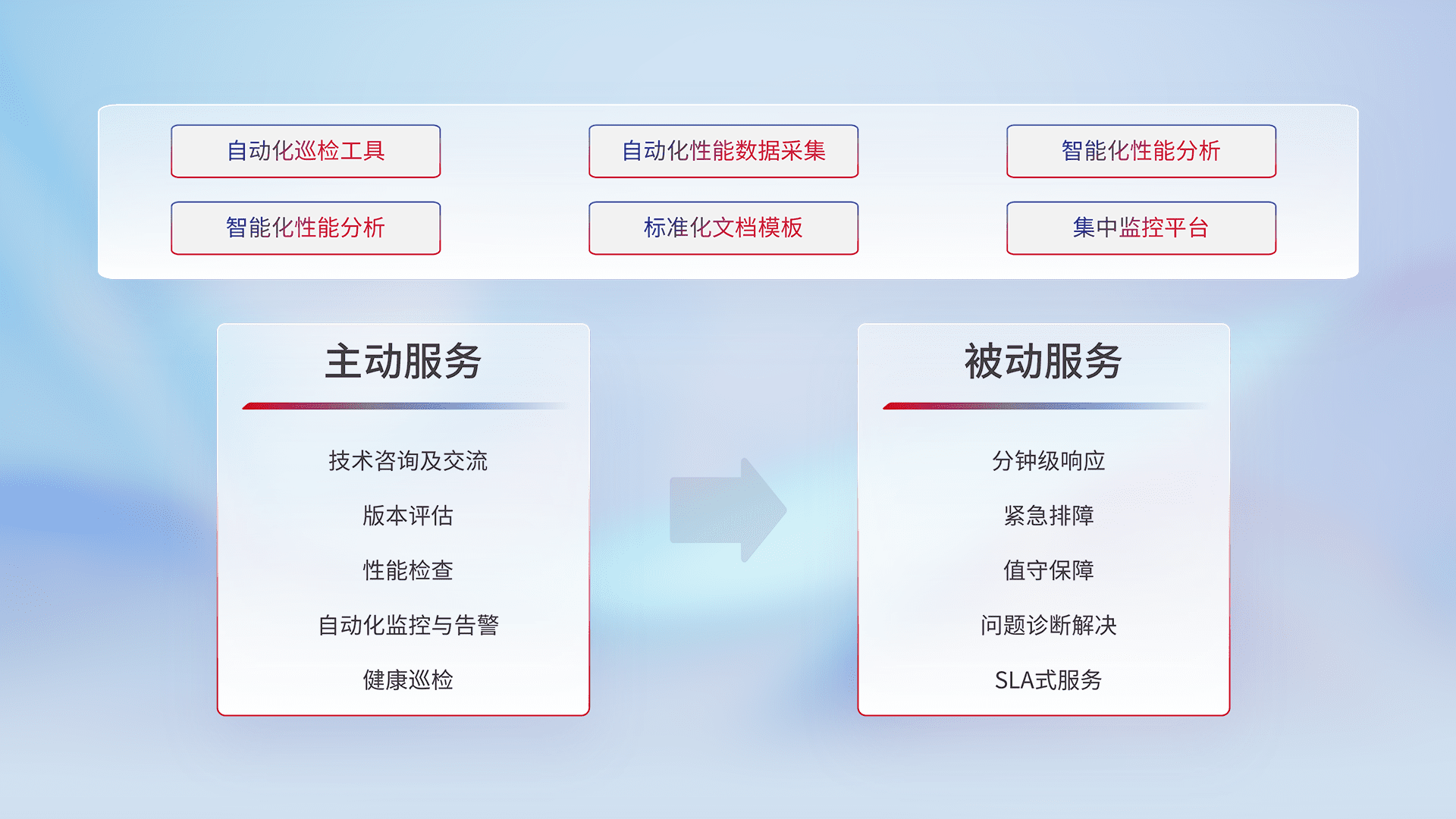 智能化工具和标准化文档,,保障服务质量,,,提供主动服务(包含技术咨询、、、版本评估、、性能检查、、、自动化监控与告警、、、健康巡检)和被动服务包含(分钟级响应、、紧急排障、、、、值守保障、、、问题诊断解决、、、、SLA服务)。。